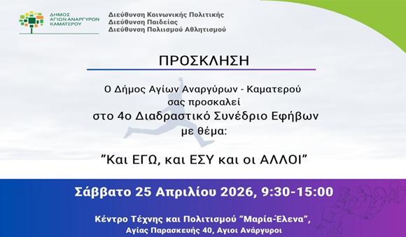 Σας ενημερώνουμε ότι το Σάββατο 25 Απριλίου 2026 από τις 09.30-15.00 στο Κέντρο Τέχνης και Πολιτισμού «Μαρία- Ελενα» θα πραγματοποιηθεί το 4ο Διαδραστικό Συνέδριο Εφήβων με τη συμμετοχή ψυχολόγων, εκπαιδευτικών, κοινωνιολόγων,  μαθητών. Στο συνέδριο θα επισημανθούν τα προειδοποιητικά σημάδια για την αναγνώριση της βίας, θα παρουσιαστούν βίντεο και βιωματικά δρώμενα, ενώ θα αναλυθούν και οι δυσκολίες των διαφυλικών σχέσεων και οι προκλήσεις.