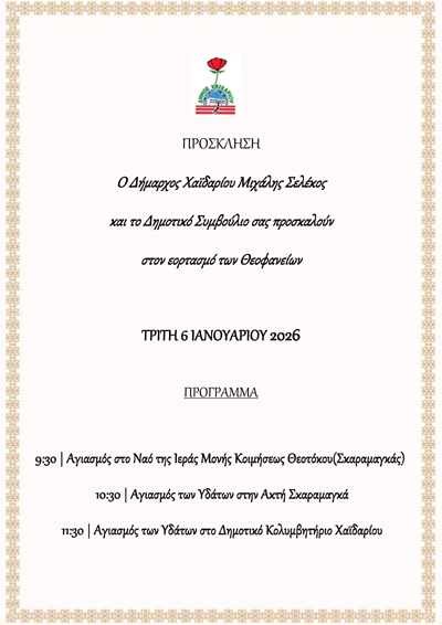ΠΡΟΓΡΑΜΜΑ ΕΟΡΤΑΣΜΟΥ ΤΩΝ ΘΕΟΦΑΝΕΙΩΝ 2026 ΣΤΟ ΔΗΜΟ ΧΑΪΔΑΡΙΟΥ
