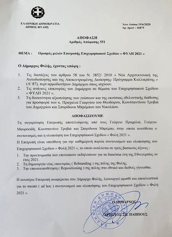 Κωνσταντίνο Τροβιά και τον πρώην Αντιδήμαρχο Σπύρο Μπρέμπο ανέθεσε ο Δήμαρχος Φυλής Χρήστος Παππούς την προετοιμασία, το συντονισμό και την υλοποίηση του Αναπτυξιακού Σχεδίου ΦΥΛΗ 2021. Αντικείμενο του Σχεδίου είναι η προετοιμασία των εκδηλώσεων για την επέτειο των 200 ετών από την Επανάσταση του 1821, η αλλαγή φυσιογνωμίας του Δήμου και η επανατοποθέτησή του στο εθνικό και το διεθνές γίγνεσθαι. Ακολουθεί η σχετική Απόφαση του Δημάρχου Φυλής.