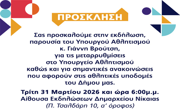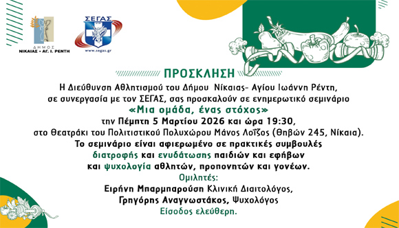 Η Διεύθυνση Αθλητισμού Δήμου Νίκαιας- Αγίου Ιωάννη Ρέντη, σε συνεργασία με τον ΣΕΓΑΣ,