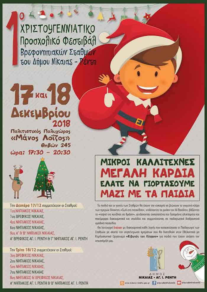 1 ο ΧΡΙΣΤΟΥΓΕΝΝΙΑΤΙΚΟ ΠΡΟΣΧΟΛΙΚΟ ΦΕΣΤΙΒΑΛ Βρεφονηπιακών Σταθμών του Δήμου: Τα παιδιά και οι γονείς των Σταθμών θα έχουν την ευκαιρία να βιώσουν το γιορτινό κλίμα των ημερών δίνοντας «ζωη στα παιχνίδια», «πλένοντας τα ρούχα του Άϊ Βασίλη», βάζοντας τα «ταψιά της κουζίνας σε δράση», φτιάχνοντας σοκολατένια και ζαχαρένια γλυκίσματα , διακοσμητικά και στολίδια, συμμετέχοντας σε παιδαγωγικά διαδραστικά παιχνίδια. Ακόμη θα λειτουργεί μπαζάρ με διακοσμητικά που κατασκεύασαν οι παιδαγωγοί των Σταθμών. Τα έσοδα θα διατεθούν στον Εθελοντικό μη Κερδοσκοπικό Οργανισμό «Κιβωτός του Κόσμου».