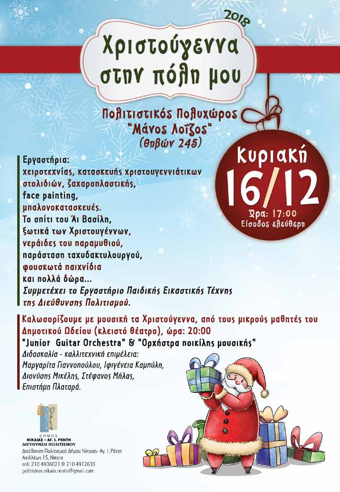 Μπισκοτόσπιτα περιμένουν χέρια παιδιών για να υπάρξουν και το ταχυδρομείο του Αϊ Βασίλη το γράμμα τους. Μουσικές μελωδίες φέρνουν τον αέρα των Χριστουγέννων και μπαζάρ με πρωτότυπα διακοσμητικά θα λειτουργήσει για την «Κιβωτό του Κόσμου». Ο Δήμος Νίκαιας-Αγ. Ι. Ρέντη έχει διοργανώσει έναν κύκλο εορταστικών εκδηλώσεων αφιερωμένο στο παιδί. Οι δράσεις θα πραγματοποιηθούν στον Πολιτιστικό Πολυχώρο «Μάνος Λοϊζος» (Θηβών 245), στην κεντρική πλατεία Αγ.Ι. Ρέντη και στις δημοτικές βιβλιοθήκες.